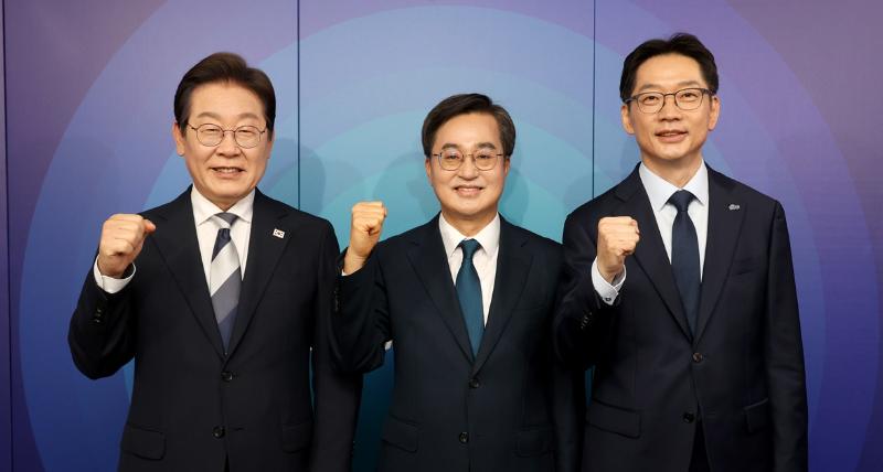 ▲이재명(왼쪽부터), 김동연, 김경수 더불어민주당 제21대 대통령선거 경선후보가 23일 오후 서울 여의도 오마이TV 초청 토론회에 앞서 기념촬영을 하고 있다.(사진=오마이뉴스 TV캡처)