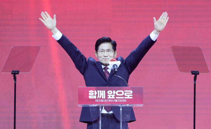 ▲국민의힘 대선 후보로 선출된 김문수 후보가 3일 경기 고양시 킨텍스에서 열린 국민의힘 전당대회에서 수락 연설에 앞서 두손을 들어 지지자들에게 인사하고 있다.