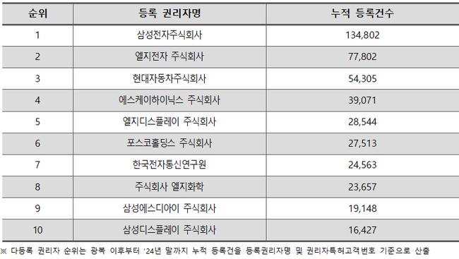 특허청은 “우리 기업과 개인의 지식재산권 활동이 산업 혁신을 뒷받침해왔다”며, “한국은 GDP 대비 특허 출원 세계 1위, 전체 특허 출원 세계 4위를 기록하며 주요 특허 강국 반열에 올랐다”고 밝혔다.