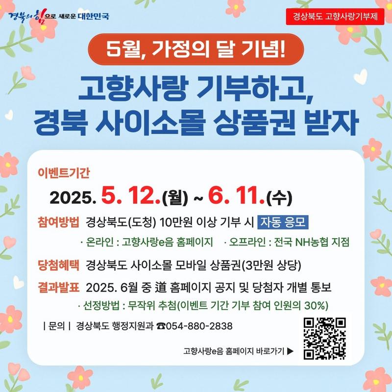 경상북도는 고향사랑 기부하고 경북 사이소 몰 상품권을 받는 이벤트를 실시한다고 경북도 서울본부가 8일 밝혔다.