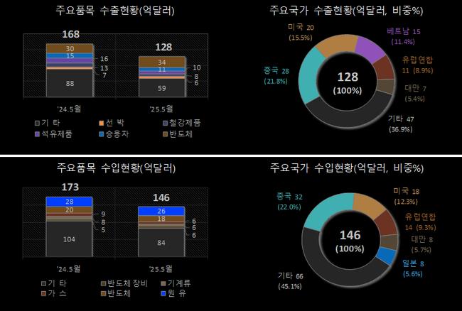 2025년 5월 1일부터 10일까지 우리나라 수출이 전년 동기 대비 23.8% 감소한 128억 달러에 그치며, 무역수지는 17억 달러 적자를 기록했다. 같은 기간 수입도 15.9% 줄어든 146억 달러로 집계됐다.