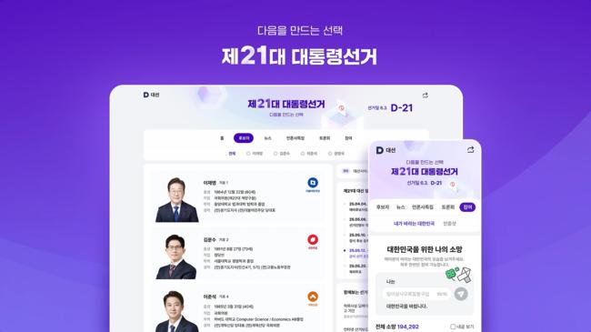 카카오의 콘텐츠CIC가 운영하는 포털 다음(Daum)은 오는 6월 3일 실시되는 제21대 대통령 선거를 앞두고, 특집페이지에 유권자 참여 기능과 후보자 정보를 대폭 강화했다고 밝혔다. 이번 개편은 `다음을 만드는 선택`이라는 슬로건 아래, 정확하고 공정한 선거 정보를 빠르게 제공하기 위한 목적이다.