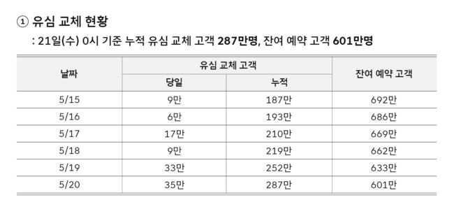 SK텔레콤은 2025년 5월 21일 0시 기준으로 누적 유심 교체 고객 수가 287만 명에 달했다고 밝혔다. 이 가운데 5월 20일 하루 동안만 35만 명이 유심을 교체한 것으로 나타났다. 같은 날 기준 유심 교체를 예약한 고객은 총 601만 명으로 집계됐다.
