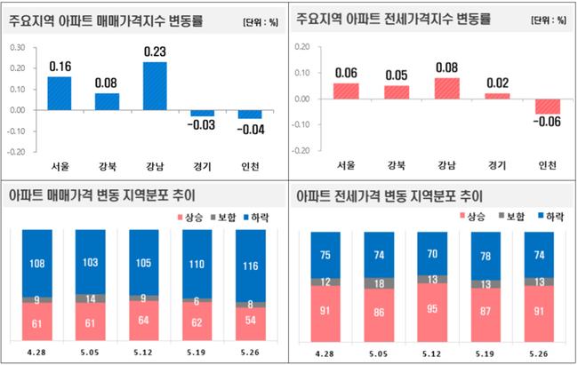 한국부동산원이 지난 5월 2일 발표한 주간 아파트가격 동향에 따르면, 5월 4주(5월 26일 기준) 전국 아파트 매매가격은 0.02% 하락해 지난주 보합에서 하락세로 돌아섰다. 수도권은 0.03% 상승으로 전주와 동일한 상승폭을 유지했고, 서울은 0.16%로 상승폭이 확대됐다. 반면 지방은 △0.06%로 하락폭이 커졌다.