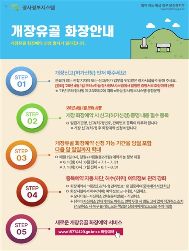 e하늘 장사정보시스템의 화장 예약 이용자 증가에 대비해 접속자 대기 시스템 용량을 확장해 국민들의 예약 진행에 불편함이 없도록 운영한다. 중복예약 차단을 위해 개장 유골 화장 예약 시 개장 신고(허가 신청) 필수 등록과 부당 예방 모니터링 등은 강화한다.