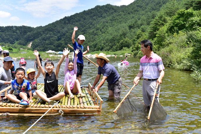 ▲경북 울진군 왕피천 ‘피래미 축제’ 참가자들이 대나무 뗏목과 낚시 체험을 하고 있다. (사진 제공=울진군)