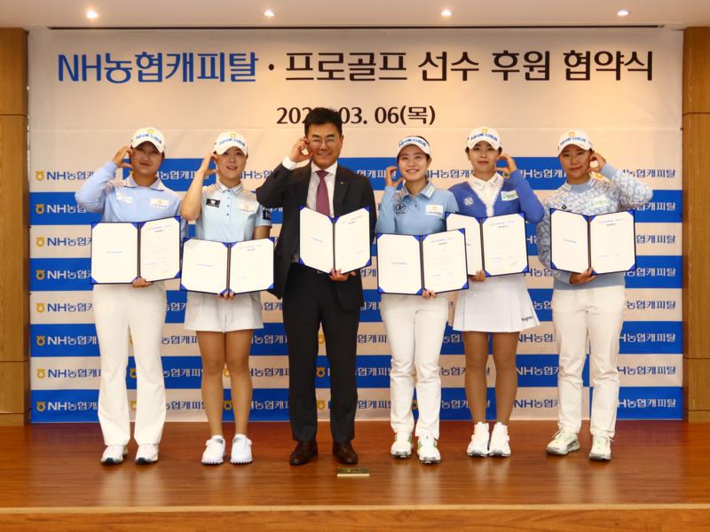 ▲장종환 NH농협캐피탈 대표이사(왼쪽에서 세번째)가 지난 3월 프로골프 후원 협약식때 (왼쪽부터) 김시현 선수, 정윤지 선수, 장 대표이사, 박민지 선수, 이가영 선수, 김혜승 선수 기념 촬영 모습.