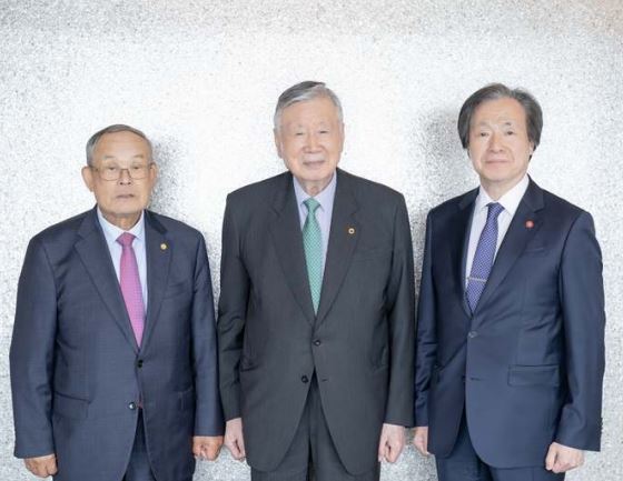 ▲이중근 대한노인회 회장(가운데)이 11일 정기석 국민건강보험공단 이사장(우측)이박용열 인천시연합회장(좌측)과 공단 담배소송 지지 간담회 후 사진촬영을 했다.