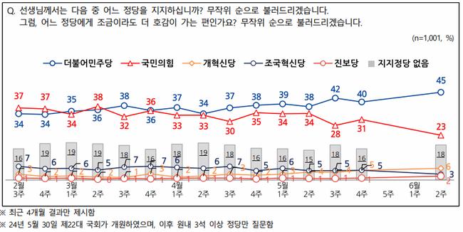 정당지지도는 ▲더불어민주당 45% ▲국민의힘 23% ▲개혁신당 6% ▲조국혁신당 3% ▲진보당 2% 순으로 나타났으며, `태도유보`(없음+모름)는 19%였다.