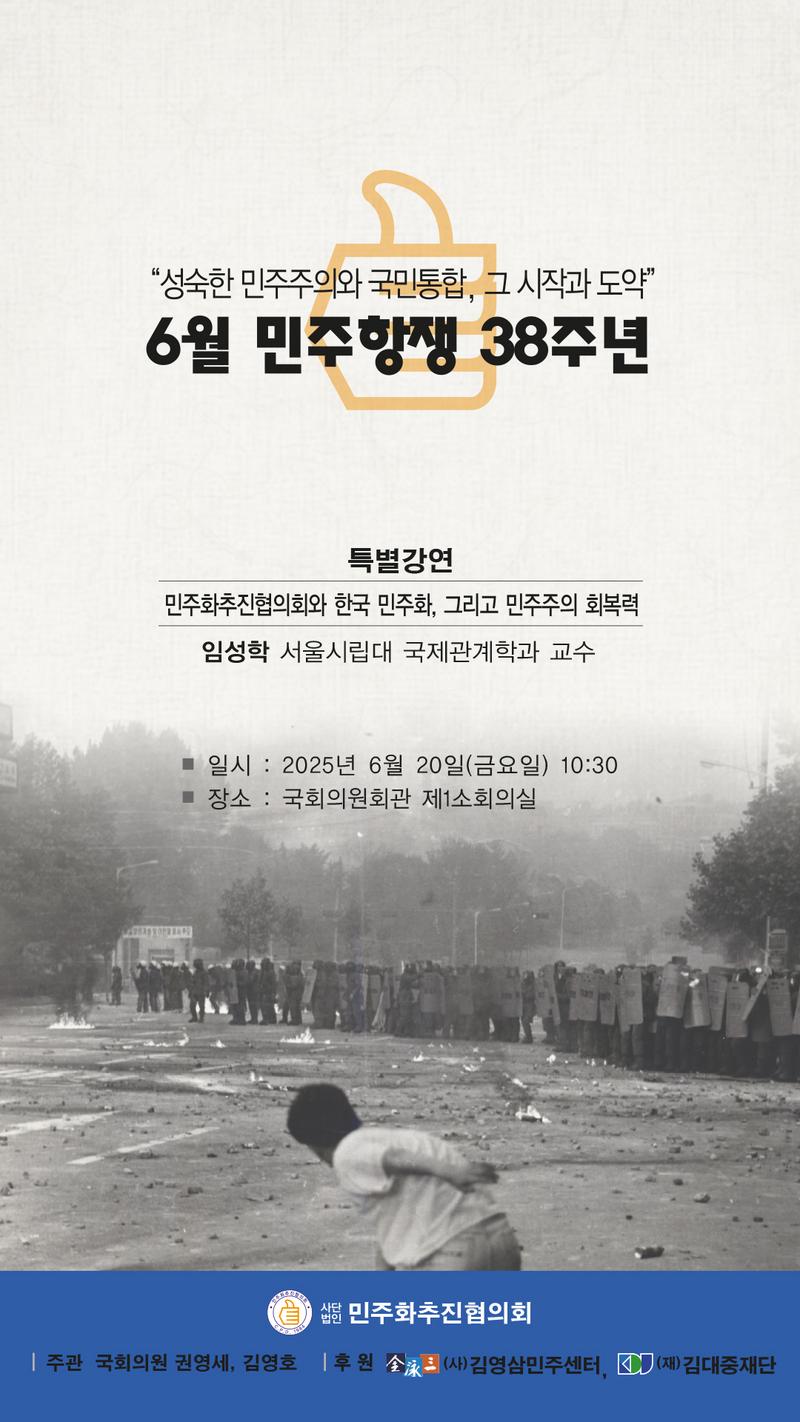 사단법인 민주화추진협의회가 오는 20일 '6월 민주항쟁 38주년 기념행사'를 개최한다.