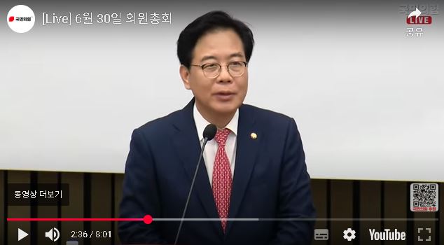 ▲국민의힘 송언석 원내대표가 30일 의원총회에서 발언하고 있다.(국민의힘 유튜브 캡처)