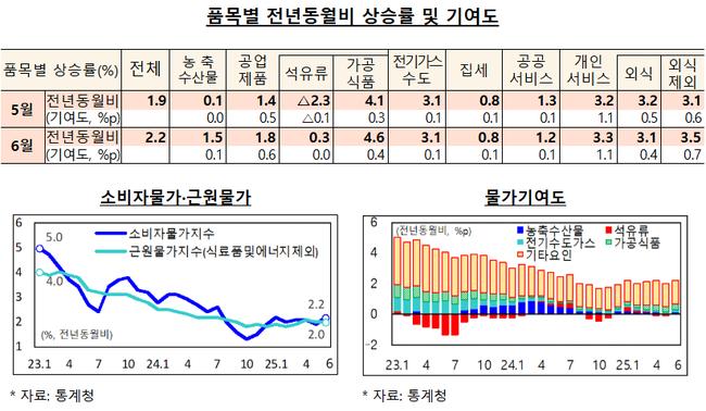변동성이 큰 식료품과 에너지를 제외한 근원물가는 전년 동월 대비 2.0% 상승해 지난달과 동일한 수준을 유지했다. 일상생활과 밀접한 품목 중심의 생활물가지수는 석유류 가격 인상 영향으로 2.5% 올랐으며, 이는 5월(2.3%)보다 0.2%p 높은 수치다.