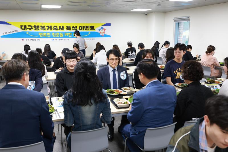 이하운 한국사학진흥재단 이사장(가운데)이 지난 6월 24일 대구행복기숙사 특식 이벤트서 입주생들과 식사를 하고 있다.(사진제공=사학재단)
