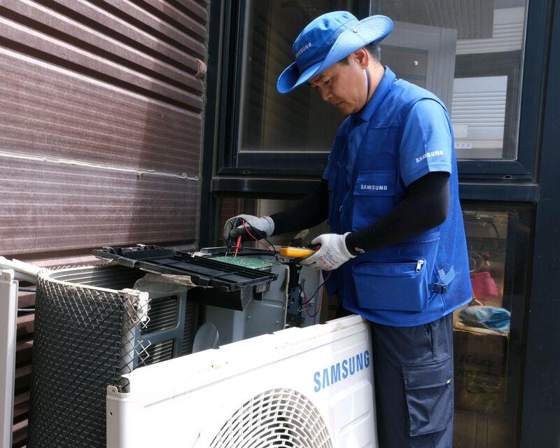 삼성전자 서비스 엔지니어가 피해 농가를 방문해 에어컨을 점검하고 있다.(사진제공=삼성)
