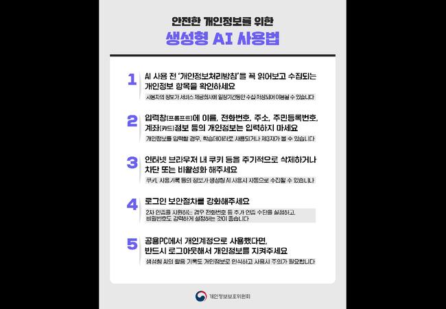 개인정보위는 "결과 발표 전까지는 서비스 이용 과정에서 보안상 우려가 지속 제기되고 있는 상황을 고려하여 신중한 이용을 당부드린다"라며, "안전한 개인정보를 위한 생성형 AI 사용법" 카드뉴스를 통해 개인정보 보호 수칙을 안내했다.