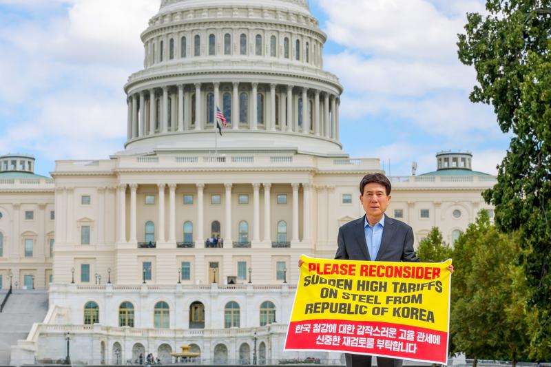 이강덕 포항시장이 지난 9월 미국 워싱턴D.C의 백악관 앞에서 한국 철강 고율 관세 재검토를 촉구하는 피켓팅을 하고 있다.(사진=이강덕 시장 페이스북 캡처)이 시장은 7일 '피를 토하는 심정으로' 제목의 자신의 페이스북 글에서 이같이 말했다.