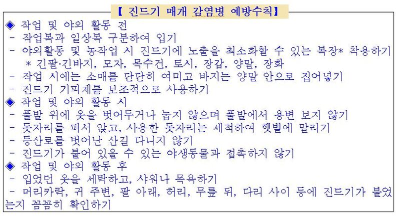 야외활동 시 모자 등을 착용해 피부 노출을 줄이고, 진드기 기피제를 사용하고, 풀밭에 바로 앉지 않고 방석이나 돗자리를 깔아 사용하는 것이 좋다.