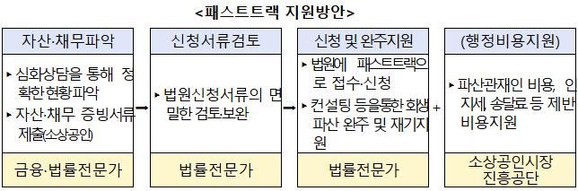 소상공인 회생·파산 패스트트랙은 현재 시범 운영 중이다. 중기부 산하 소상공인 새출발지원센터가 전문가 기반의 회생·파산 행정 절차를 지원하고, 서울회생법원은 전담재판부를 통해 심사와 조정을 신속히 처리하는 구조다.