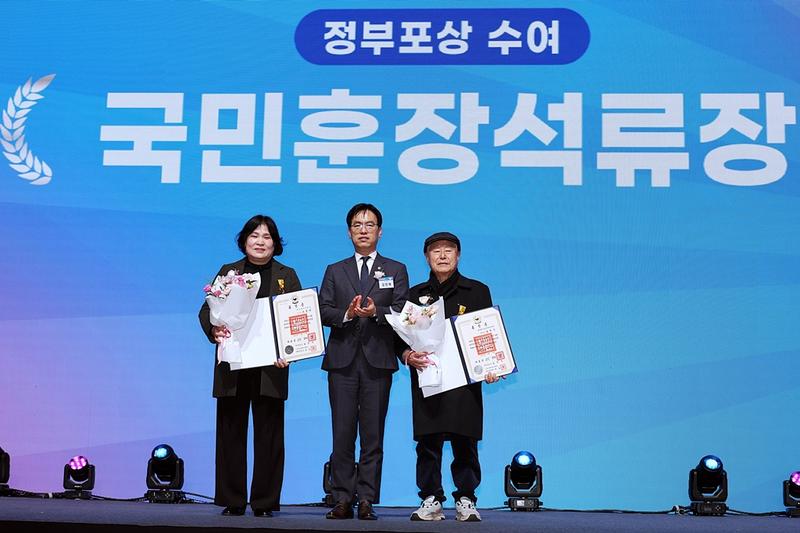 김민재 행정안전부 차관(가운데)이 국민훈장 석류장 수상자인 임형순 씨(왼쪽), 이경채 씨(오른쪽)와 기념 촬영을 하고 있다.