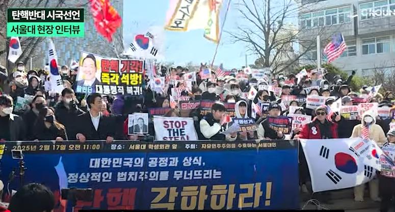 ▲지난 17일 서울대 관악캠퍼스 학생회관 앞 아크로폴리스 광장에서 윤석열 대통령 탄핵을 반대하는 학생들이 집회를 열고 있다. (사진=그라운드씨(GROUND C)유튜브 갈무리)