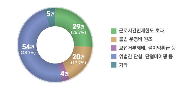 점검 결과, 적발된 주요 위법 사항으로는 ▲근로시간면제 한도 초과 ▲불법 운영비 원조 ▲교섭 거부 및 해태 ▲쟁의행위를 이유로 한 불이익 취급 ▲위법한 단체협약 등이 포함됐다.