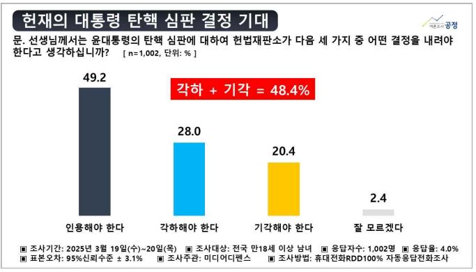 서요한 여론조사 공정 대표는 “인용 49.2, 각하+기각=48.4% 박빙으로 '인용'과 '각하+기각'의 차이가 0.8%로 나타나 우열을 가리기 어렵게 됐다”고 분석했다.