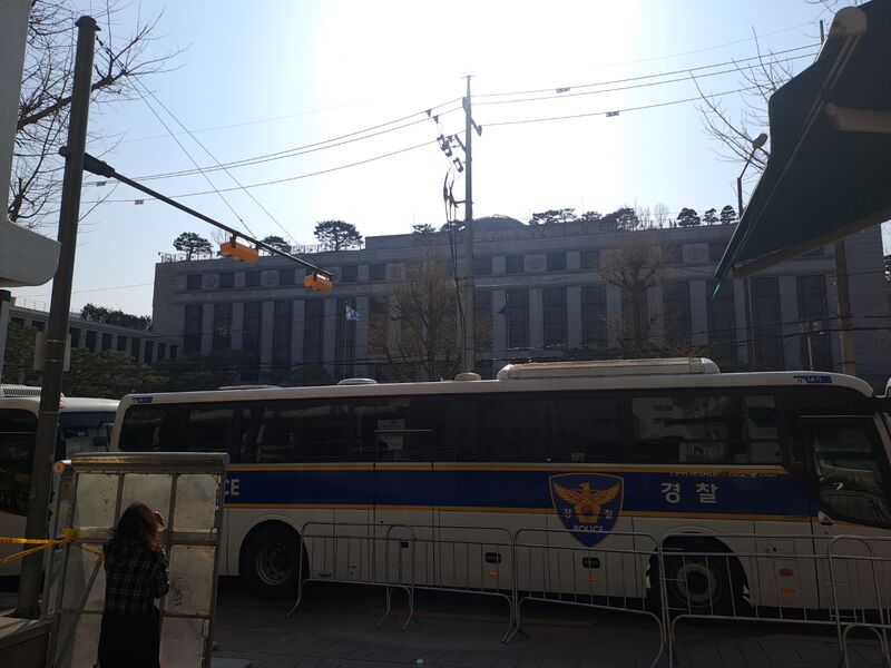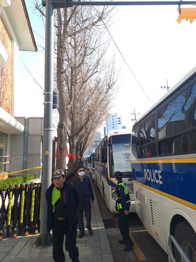 윤석열 대통령 탄핵 심판 선고를 앞둔 22일 오후 서울 종로구 헌법재판소 주변은 경찰 버스가 2중으로 가로 막는 등 철저히 통제되고 있었다.